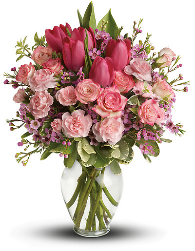 It's beauty-full! Bursting with tantalizing tulips and radiant roses, this delightful pink arrangement brings spring joy to that special someone.