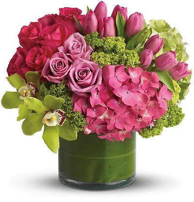 Like a girl's getaway to the tropics! Feminine flowers in tropical pastels brighten her day - and her feng shui. She'll love the beautiful serenity and balanced, Zen-like feel of the lush pink and green blooms.