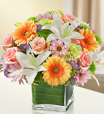 Express your sympathy and compassion perfectly with this beautiful multicolored arrangement of pastel blooms such as roses, Gerberas, lilies, carnations and more. A comforting tribute for the home or memorial service.